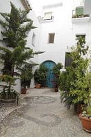 Ein spanischer Innenhof mit vielen Pflanzen in Frigliana, Andalusien in Spanien. Ein weißes Bergdorf mit vielen nostalgischen Straßen und schöner Architektur.