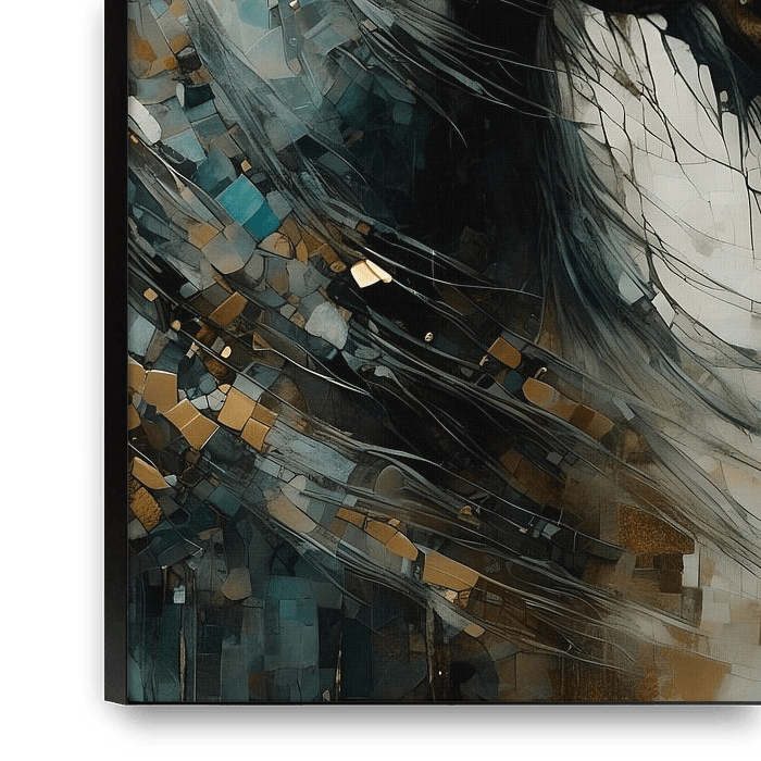 Eine digitale Darstellung eines Pferdekopfes verbindet abstrakte geometrische Formen mit realistischeren Details. Braun-, Gold- und Teetöne werden verwendet, um einen dynamischen und fragmentierten Effekt zu erzeugen, der dem Werk ein Gefühl von Bewegung verleiht.