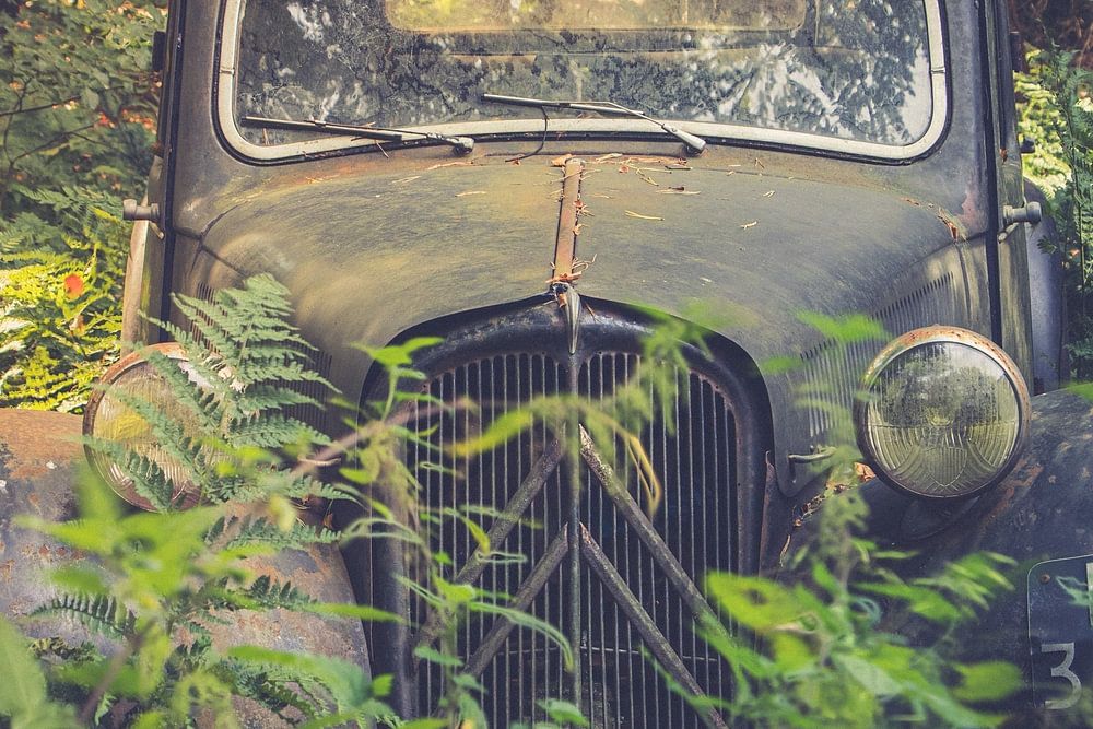 Ein verlassener Citroën im Wald, auf den schönes Licht fällt.