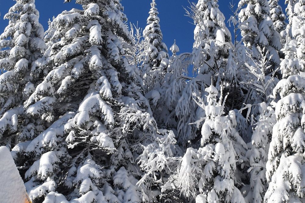 Ein verschneiter Wald nach einem Sturm, Quebec, Kanada