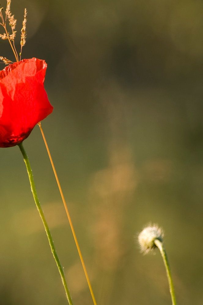 Zwischen den Mohnblumen wachsen Ähren einer Grasart. Sie sind etwa gleich lang und nähern sich der Schönheit des anderen an. Zusammen bilden sie ein zartes, sommerliches Schauspiel in der frühen Morgensonne.
