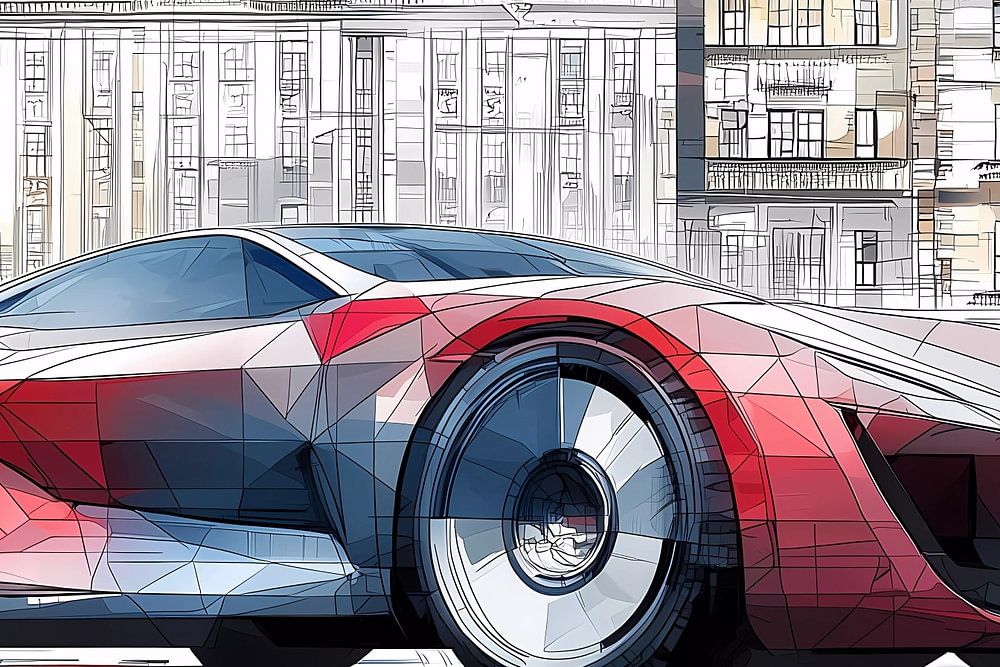 Ein zukünftiges Auto auf einer Stadtstraße mit Bäumen eines Boulevards.