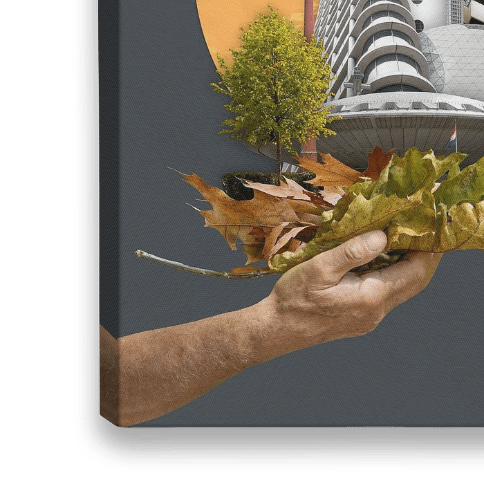 Collage von Gebäuden in Eindhoven wie Blob, Evoluon, Trudotoren, Vestedatoren und Catharinakerk Sterrenwacht und auf der Hand mit Blättern im Sonnenuntergang.