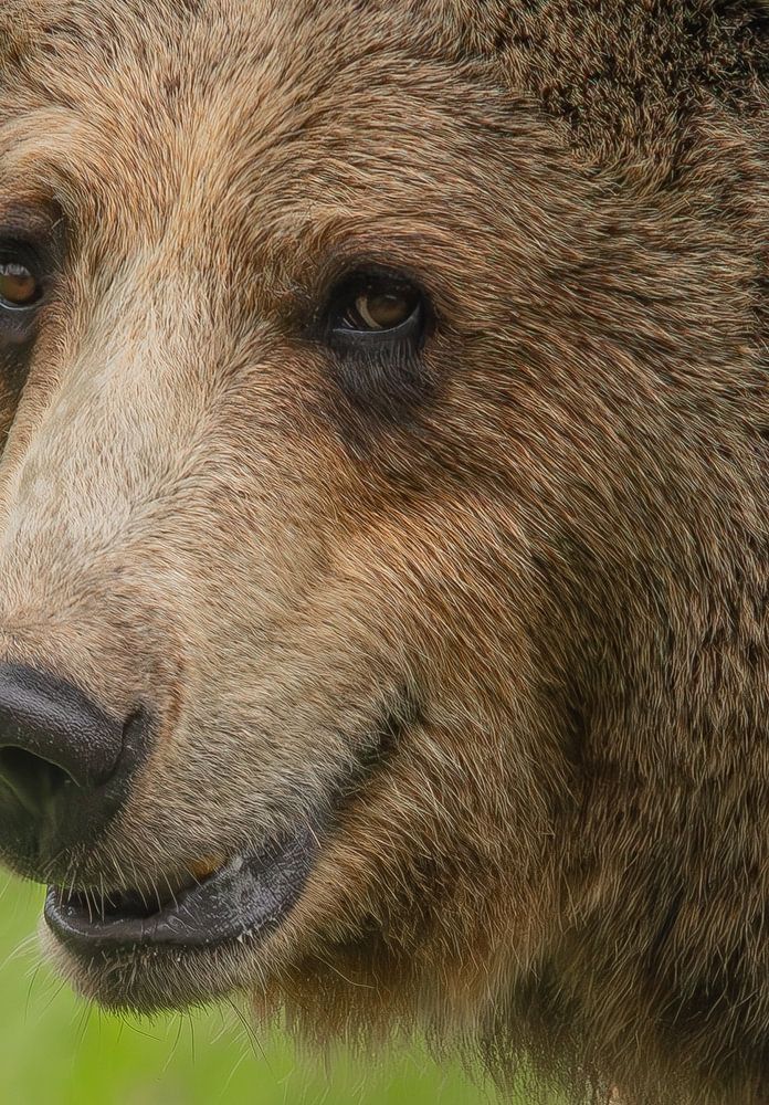 Lassen Sie Ihre Wand mit dieser atemberaubenden Nahaufnahme des großen, massiven Kopfes eines europäischen Braunbären sprechen, der lächelnd im grünen Gras der Wildnis ruht.
