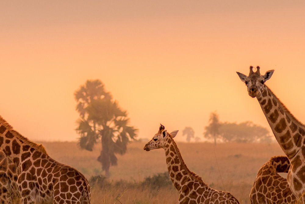 Eine Giraffenfamilie im Morgenlicht. Foto aufgenommen im Murchison Falls National Park, Uganda.