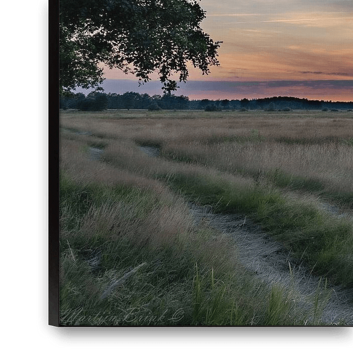 Sie sehen eine Landschaft in Drenthe. In der Nähe von Donderen. Es gibt einen Weg, die Sonne geht gerade unter und alles ist ruhig und still. Ab und zu huscht ein Tier durch die Büsche.
