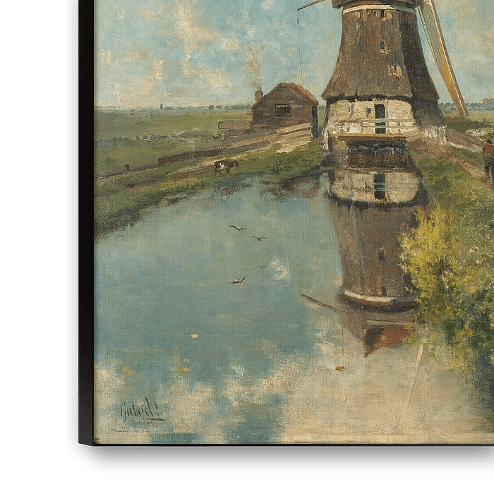 Öl auf Leinwand, H 102 cm × B 66 cm × T 14 cm. 'Unser Land ist bunt-saftig-fett. (...) Ich wiederhole, unser Land ist nicht grau, auch nicht bei grauem Wetter, die Dünen sind auch nicht grau ', schrieb Constant Gabriel in einem Brief. Im Gegensatz zu vielen Malern der Haager Schule malt er gerne einen schönen Sommertag. In diesem Bild gibt es sogar zwei: Das Gras, der Himmel und die Mühle spiegeln sich im Wasser.