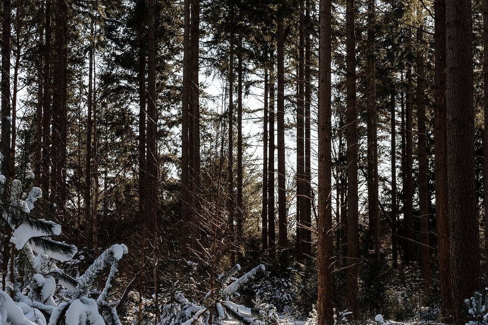 Wunderschön, all diese geraden Baumstämme, der Schnee im Vordergrund und die Sonne, die durch die Bäume scheint.