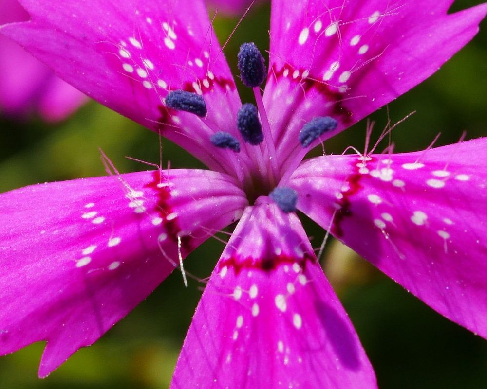 Die Steinnelke, eine einheimische Pflanze. Der Stempel und die Staubgefäße stehen auf der Speisekarte eines Insekts. Leider ist dies nur zu erkennen, wenn das Foto mit einem Makroobjektiv aufgenommen und vergrößert wird.