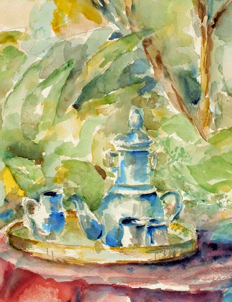 Draußen im Garten eine leckere Tasse Kaffee trinken, hier in Aquarell festgehalten. Ein sommerliches Bild. Die Kaffeekanne steht mit den Kaffeetassen auf einem Tablett. Auf dem Tisch liegt ein rosa Tischtuch, das im Wind flattert.
