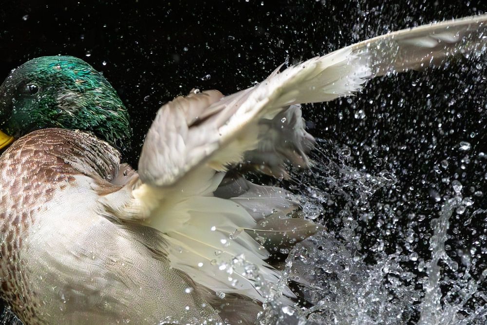 Von weitem hörte ich diese 'wilde' Ente, viel spritzendes Wasser und Gequake. Als ich näher kam, sah ich zwei Enten, die eifrig mit ihren Flügeln auf dem Wasser schlugen. Schnell machte ich ein paar Fotos, um diesen Moment festzuhalten: Die Bewegung des Wassers und der Vögel kommt hier wunderbar zur Geltung. Der schwarze Hintergrund ist durch die dunklen Lichtverhältnisse entstanden; die Ente schwamm in einem von hohen Bäumen umgebenen Teich.