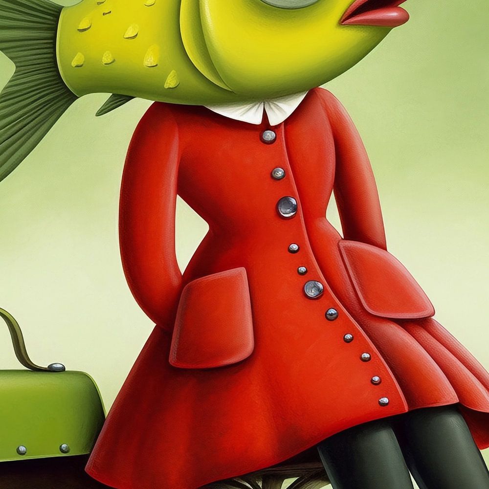Ein anthropomorpher Fisch mit dem Körper einer Frau in einem roten Mantel und schwarzen Stiefeln und dem Kopf eines gelben Fisches. Dieses Werk wurde in Zusammenarbeit mit künstlicher Intelligenz geschaffen.