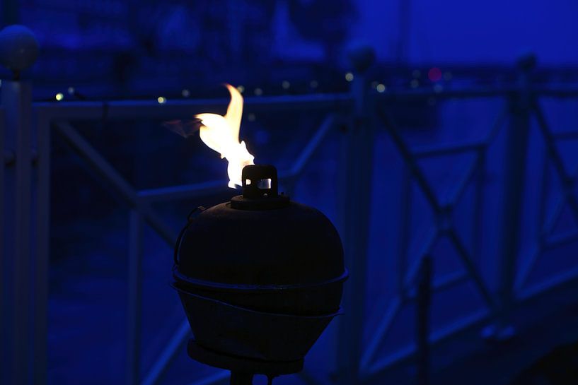Bestelle das Foto Eine brennende Öllampe am Wasser in entspannter Atmosphäre in Dänemark. von Martin Köbsch als Reproduktion auf Leinwand, Alu-Dibond, als Poster, Fototapete oder Acrylglasbild.