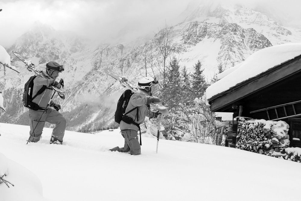 Zwei Männer mit Skiern auf den Schultern laufen durch eine frisch verschneite Landschaft oberhalb von Les Houches in den französischen Alpen. Eine Kiefer ist eingeschneit und das Dach eines Holzhauses ist ebenfalls mit Schnee bedeckt.