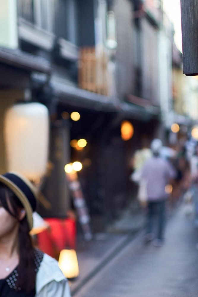 Ein junges, verliebtes Paar spaziert abends gemeinsam durch die engen Gassen Kyotos.