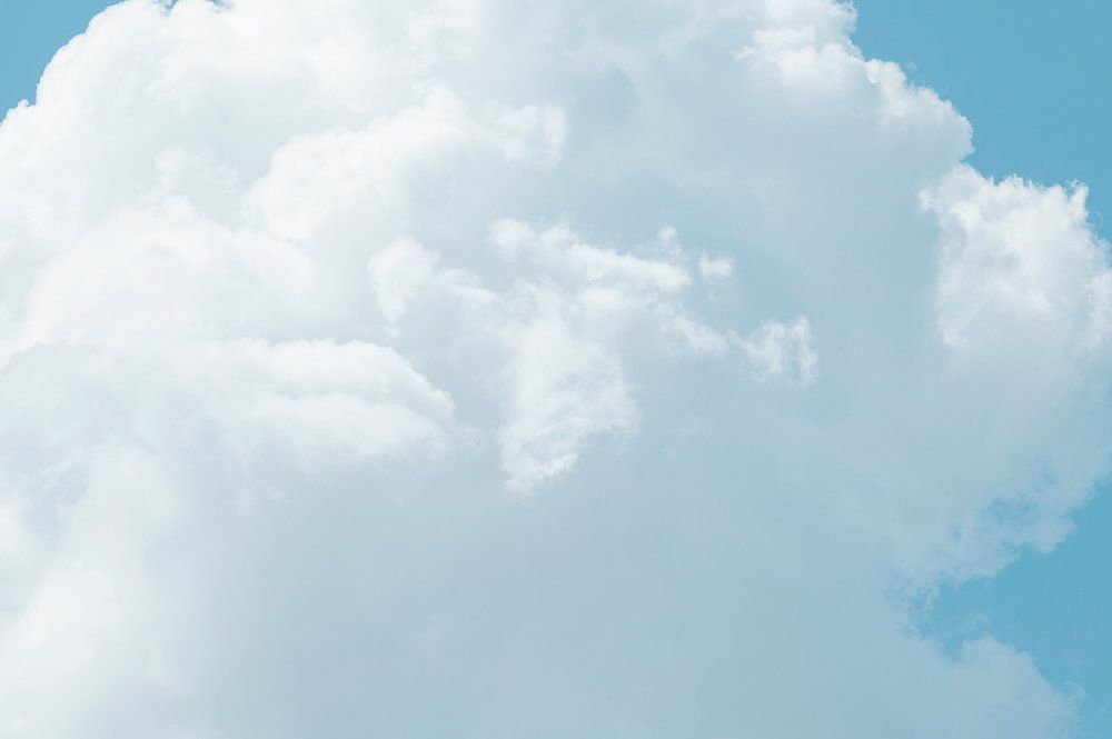 Eine einzelne weiße flauschige Wolke, umgeben vom blauen Himmel im Hochsommer. Das Bild wurde in den Niederlanden aufgenommen. Farbe leicht angepasst an ein weicheres Blau. Keine weiteren Bearbeitungen.
