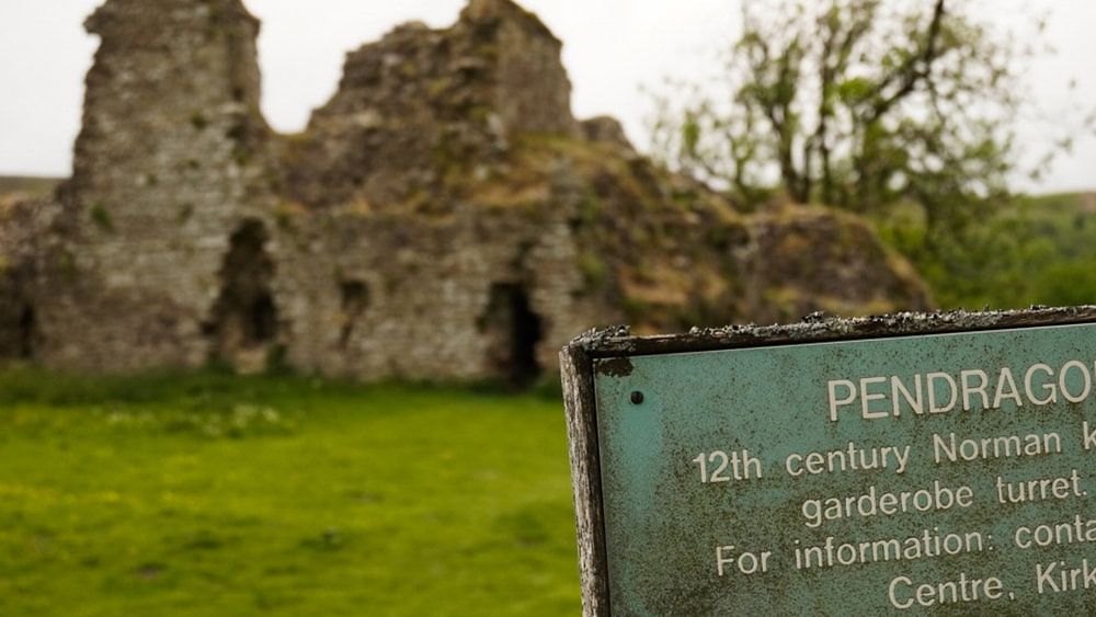 Diese alte Ruine steht irgendwo in der natürlichen Umgebung von Wales in England. Das Schild davor ist durch die Zeit verbogen und beginnt zu verwittern, so wie es die Ruine seit Jahren tut.