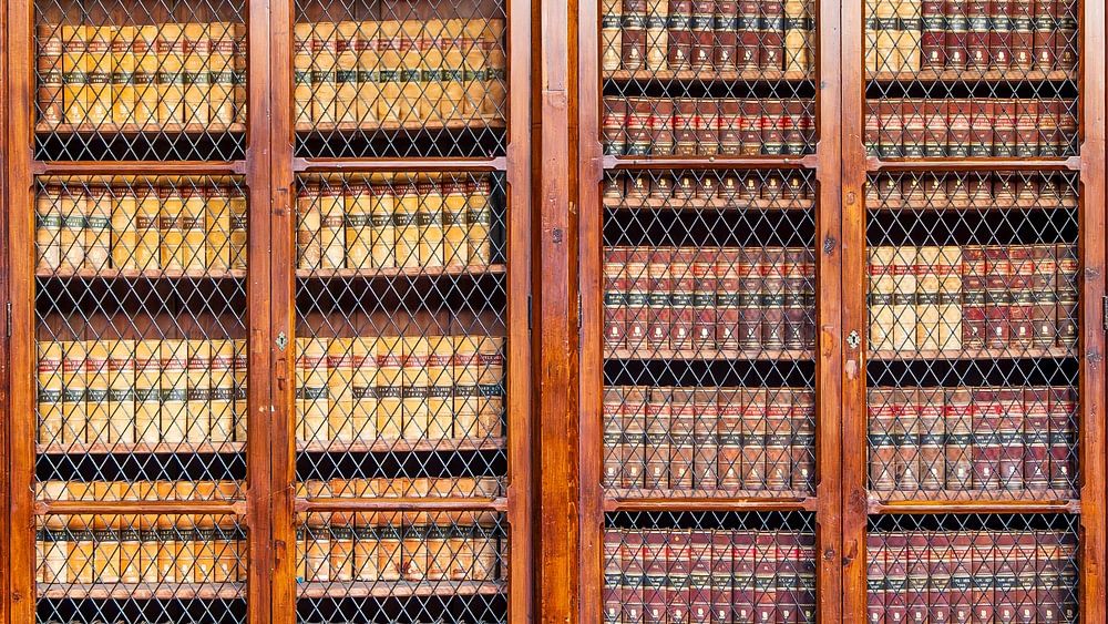 Dies ist ein Bild eines hölzernen Wandschranks mit alten historischen Büchern, vielleicht Enzyklopädien. Das Foto wurde in der Aula Maxima der Universität von Cork in Irland aufgenommen.