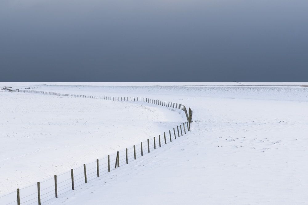 Eine leere, schneebedeckte Winterlandschaft im Nationalpark Lauwersmeer. Am Horizont treiben dunkle Schneewolken heran und verleihen der Landschaft eine bedrohliche Atmosphäre. Ein minimalistisches Foto.