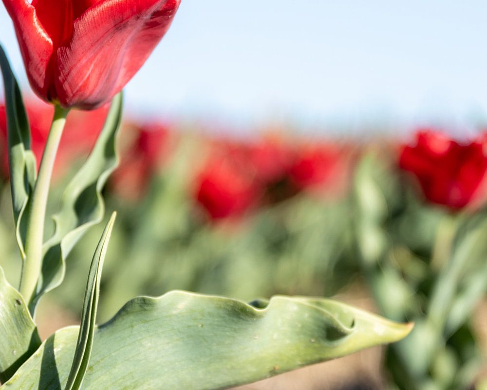Eine rote Tulpe steht allein inmitten eines Tulpenfeldes.