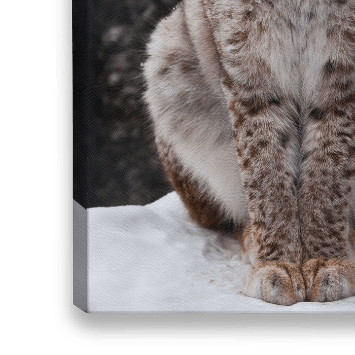 Bestelle das Foto Eine schöne und stolze Waldwildkatze Luchs sitzt aufrecht und schaut mit klaren Augen. Auf dem Schne von Michael Semenov als Reproduktion auf Leinwand, Alu-Dibond, als Poster, Fototapete oder Acrylglasbild.