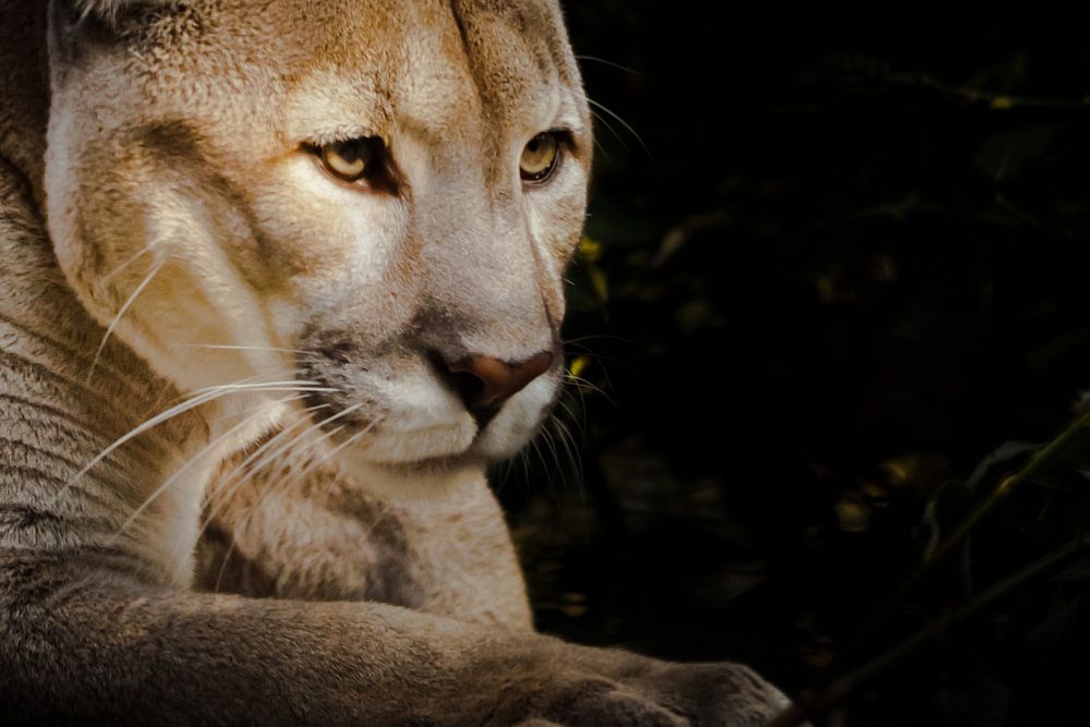 Eine stolze schöne Raubkatze sitzt in der Dunkelheit. Katze im Nachtwald, schwarzer Hintergrund. Puma (Puma) sitzt auf einer Plattform, umgeben von grünen Blättern, einer großen Katze.