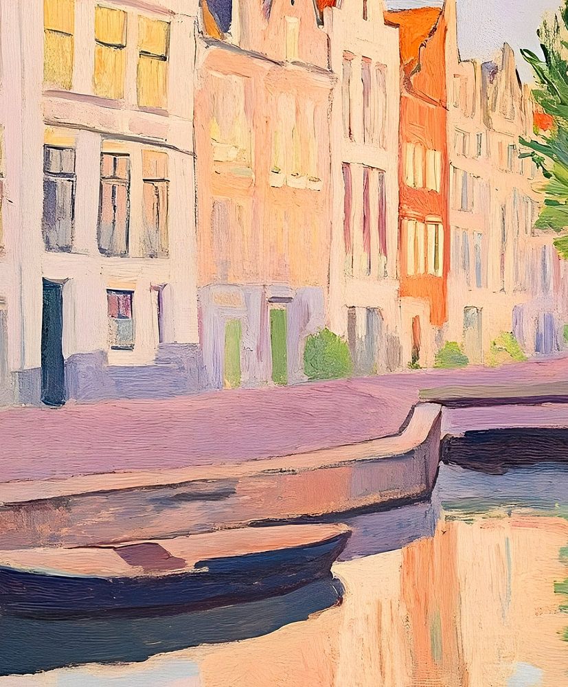 Momentaufnahme von Amsterdam, wo sich im ruhigen Wasser die bunten Fassaden der Stadt spiegeln und einen zeitlosen Charme versprühen.