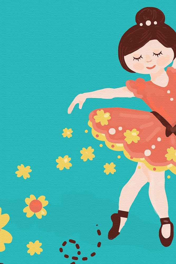 Eine Ballerina tanzt anmutig mit einem Wirbel aus gelben Blumen vor einem türkisfarbenen Hintergrund mit Sternen.