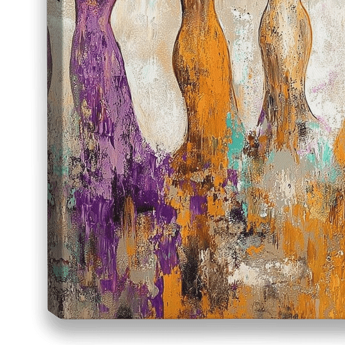 Dieses ausdrucksstarke Gemälde zeigt eine Gruppe abstrakter weiblicher Figuren, die in einem kraftvollen und fröhlichen Rhythmus miteinander verbunden sind. Die tanzenden Frauen, die in leuchtende Farben wie Lila, Orange, Grün und Türkis gekleidet sind, symbolisieren die Kraft der Einheit und Zusammenarbeit. Die dynamische Bewegung der…