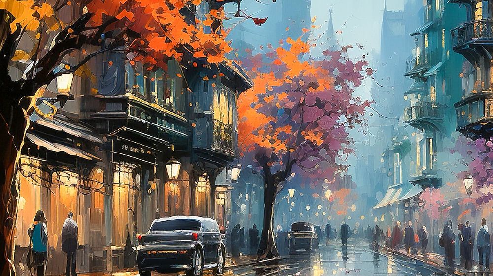 Einkaufstour in einer Stadt mit herbstlichen Bäumen bei Nacht Kunst Malerei
