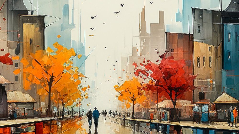 Einkaufstour in einer Stadt mit herbstlichen bäumen Kunst Malerei