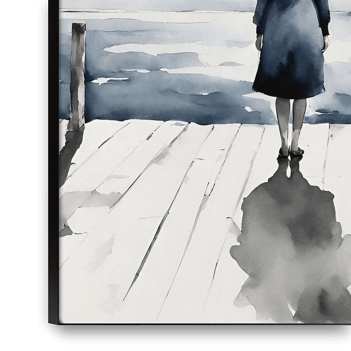 Einsame Frau auf Steg schaut aufs Meer, Holzsteg, Möven, blaues Kleid, sanfte Farben, Horizont, Wasserfarben, Aquarell