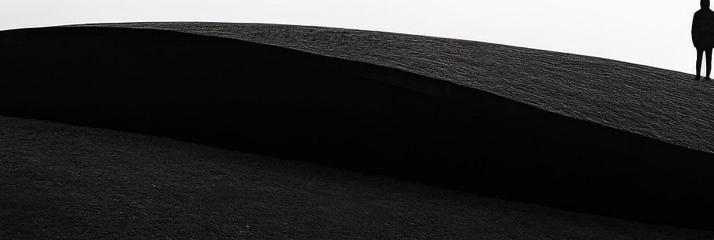 Auf dem Bild entfaltet sich eine eindrucksvolle, monochrome Landschaft, in der sanfte, geschwungene Hügel harmonisch ansteigen. Im Vordergrund steht eine einsame Silhouette, die die Stille und Weite der Szene betont. Die starke Kontrastierung zwischen Licht und Schatten verstärkt das Gefühl von Einsamkeit und Reflexion in dieser fast surrealen Umgebung.
