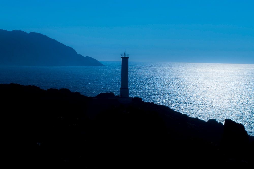 Hinter dem Leuchtturm taucht eine kleine Insel auf, die sich schemenhaft vom Nachthimmel abhebt. Die Kombination aus Leuchtturm, Klippe und Insel bildet eine beeindruckende Landschaft, die zum Erkunden und Nachdenken einlädt. Das ruhige Wasser, das die Klippe umgibt, verleiht dieser bezaubernden Szene eine zusätzliche Ebene der Ruhe.