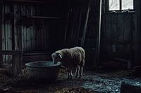 Bestelle dieses Stilleben Einsames Schaf in der Scheune von Art & Soul Creations als Reproduktion auf Leinwand, Alu-Dibond, als Poster, Fototapete oder Acrylglasbild.