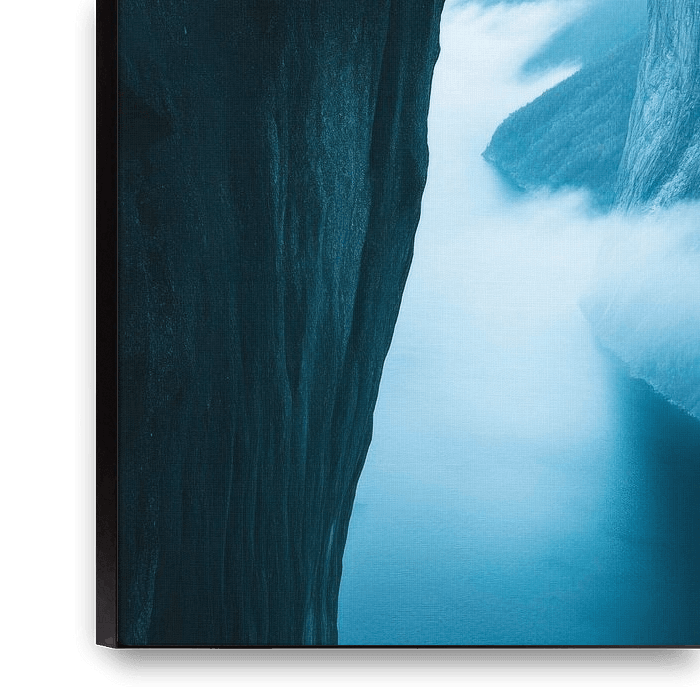 In dieser eindrucksvollen Landschaft steht eine einsame Figur am Rand einer steilen Klippe, umgeben von majestätischen fjordartigen Bergen. Der sanfte Nebel und der kühle Farbton verleihen der Szenerie eine mystische Atmosphäre, während das ruhige Wasser tief unten eine geheimnisvolle Tiefe suggeriert. Ein beeindruckendes Zusammenspiel…