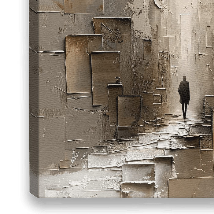Eine einsame Figur geht durch eine verlassene Stadt.