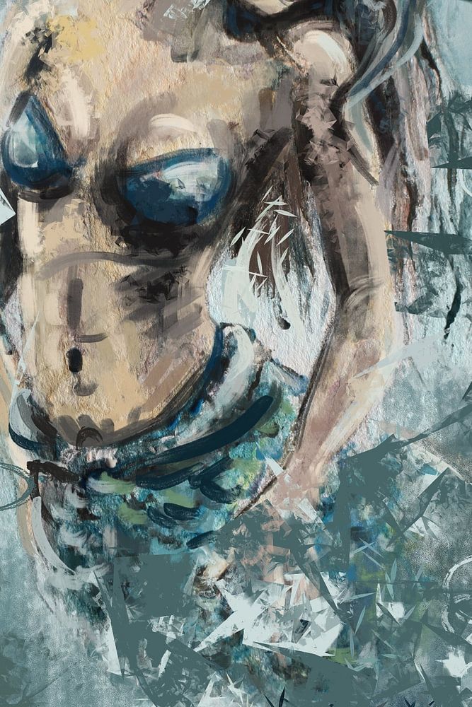 Diese Meerjungfrau taucht in einen eiskalten Ozean ein. Die Farben dieses Werks weisen graublaue und hellgraue Akzente auf, die dem Wasser ein etwas kaltes Aussehen verleihen. Dieses Werk ist dem Fantasy-Genre zuzuordnen. Die Meerjungfrau hat ihre Augen geschlossen und scheint aus den Tiefen des Ozeans emporzuschwimmen.