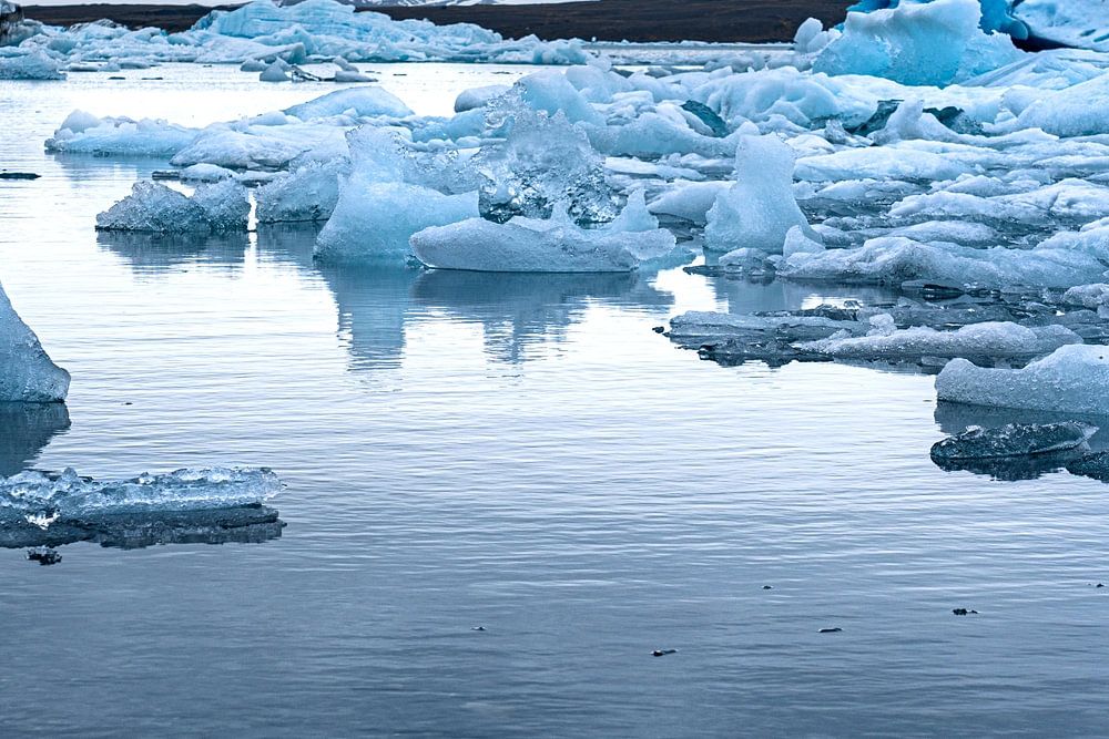 Treibendes Eis auf der Wasseroberfläche des Gletschersees bei Jokülsarlon im Süden Islands. Der dunkle Tag schafft eine dramatische Atmosphäre zwischen dem blauen Eis und dem spiegelnden See.