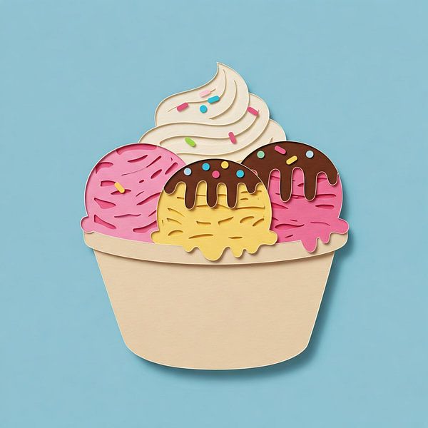 Niedliches pastellfarbenes Papierschnittkunstwerk eines Eisbechers mit Schlagsahne. Ideal für Cafés, Küchen oder verspielte Kunstsammlungen.