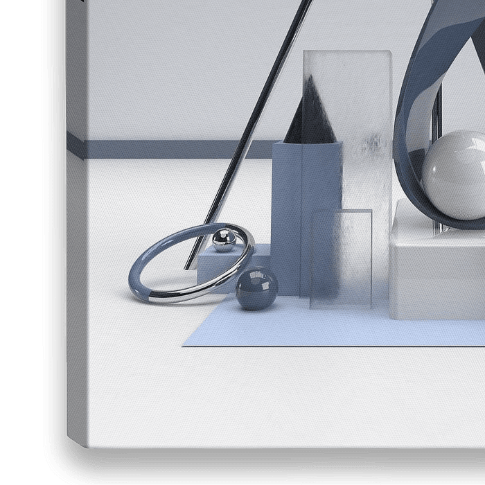 Dreidimensionales (3D) abstraktes Design in moderner Kunst mit Grundformen und Materialien in den Farben Eis, Weiß und Blau, mit Metallakzenten. Siehe auch Icy Blue 1, um ein Diptychon zu bilden. Andere Farben sind auf Anfrage erhältlich.