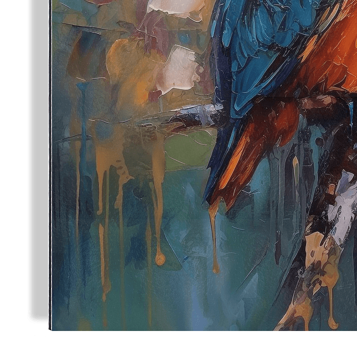 Bild eines Eisvogels. Acrylfarbe in Spachteltechnik. Schöne warme Farben, schön mit dem Hintergrund abgestimmt. Farbschema aus Blau, Orange, Braun und Weiß. Passt zu verschiedenen Stilen und Trends.