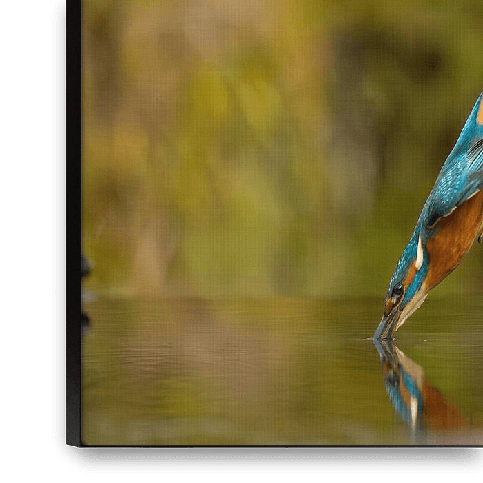 Bestelle dieses Vögel Wandbild Eisvogel im Flug. von Menno Schaefer als Reproduktion auf Leinwand, Alu-Dibond, als Poster, Fototapete, ArtFrame oder Acrylglasbild, maßgefertigt in höchster Qualität.