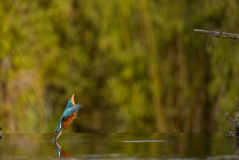 Der Eisvogel, der schönste Vogel der Niederlande, in vollem Flug auf dem Weg zum Fischfang unter Wasser. Er fängt den Fisch mit seinem Schnabel, der etwas ganz Besonderes ist, weil er die Brechung des Wassers kennt und ihn nie verfehlt. Die leuchtend blaue und orange Farbe ist charakteristisch für diesen schönen Vogel.