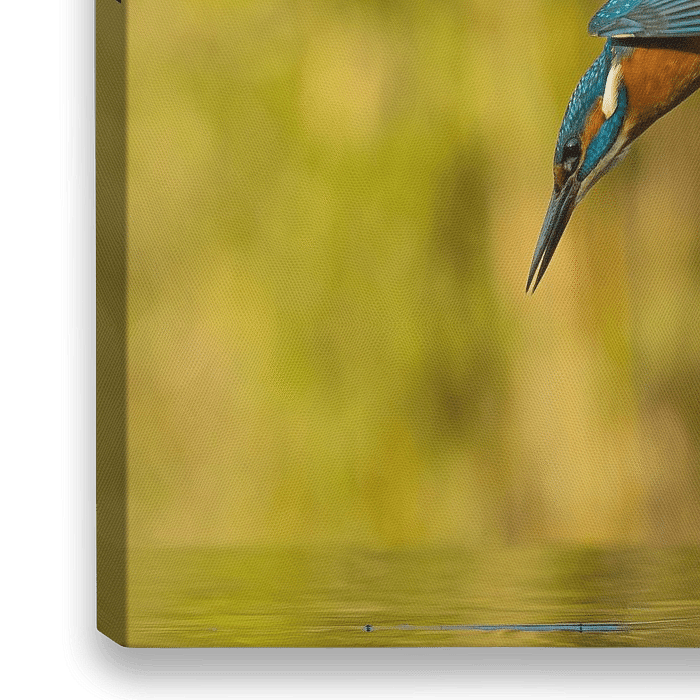 Bestelle dieses Vögel Wandbild Eisvogel im Flug. von Menno Schaefer als Reproduktion auf Leinwand, Alu-Dibond, als Poster, Fototapete, ArtFrame oder Acrylglasbild, maßgefertigt in höchster Qualität.