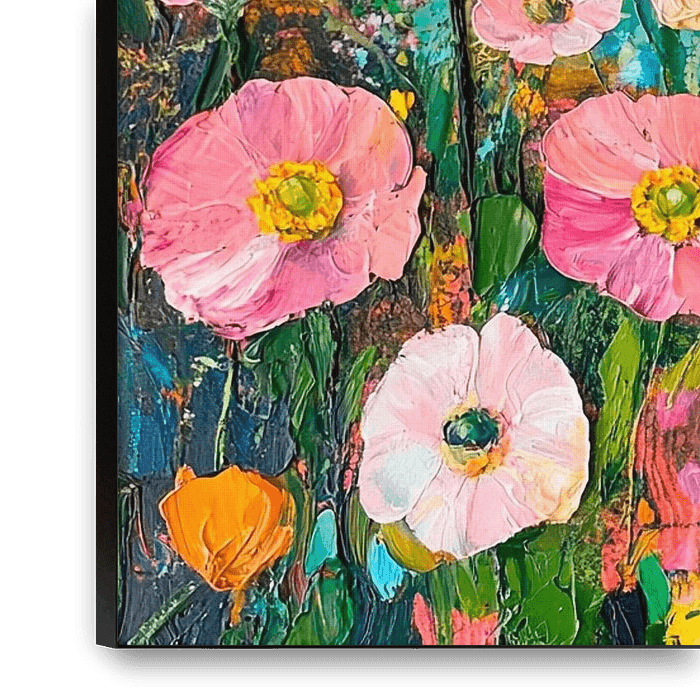 Dieser Eisvogel sitzt inmitten eines üppigen Blumenfeldes, gemalt mit lebhaften Pinselstrichen voller Textur und Bewegung. Dieses Werk verbindet die Natur mit ausdrucksstarker Kunst und passt perfekt in ein Interieur, das nach Farbe, Fröhlichkeit und Charakter verlangt.