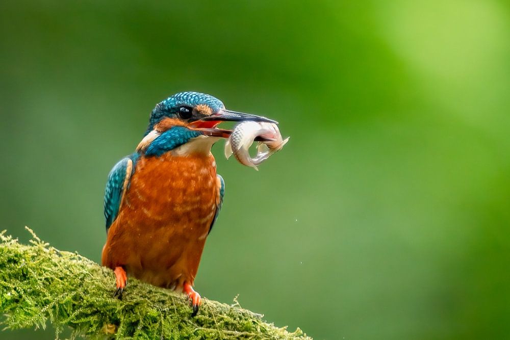 Der Eisvogel auf einem mit Moos bedeckten Ast fotografiert. In seinem Schnabel hält er einen Fisch, den er gerade gefangen hat. Das Männchen zeichnet sich durch seinen schwarzen Schnabel aus. Schönes, weiches Morgenlicht mit einem weichen Hintergrund, der den Eisvogel auf dem Foto gut zur Geltung bringt.