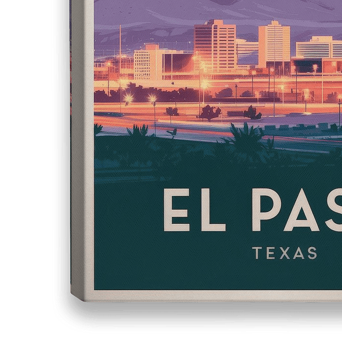 Ein lebendiges Farbenspiel entfaltet sich über der Skyline von El Paso, während sanfte Bergsilhouetten die Szene rahmen. Die warmen, einladenden Töne des Sonnenuntergangs verleihen dem Raum eine besondere Atmosphäre. Ideal für das Wohnzimmer, schafft dieses Kunstwerk einen inspirierenden Blickfang, der Erinnerungen an Abenteuer und Fernweh weckt.