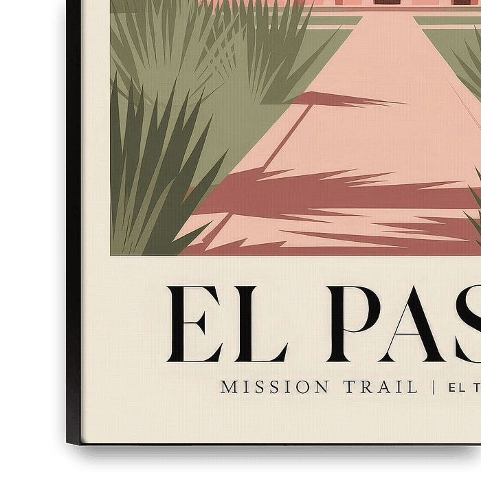 Mit sanften Erdtönen und klaren Linien fängt das Bild die charmante Architektur von El Paso ein, umgeben von der Natur der Wüste. Die harmonische Verbindung von Geschichte und Landschaft verleiht jedem Raum eine nostalgische Atmosphäre. Ideal für das Wohnzimmer, wo es Gespräche anregt und Erinnerungen weckt.