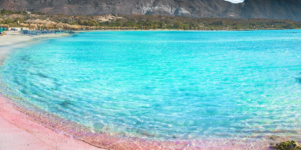 Der Strand ist benannt nach der vorgelagerten Insel Elafonisi und besticht durch seinen teilweise rosafarbenen Sand .